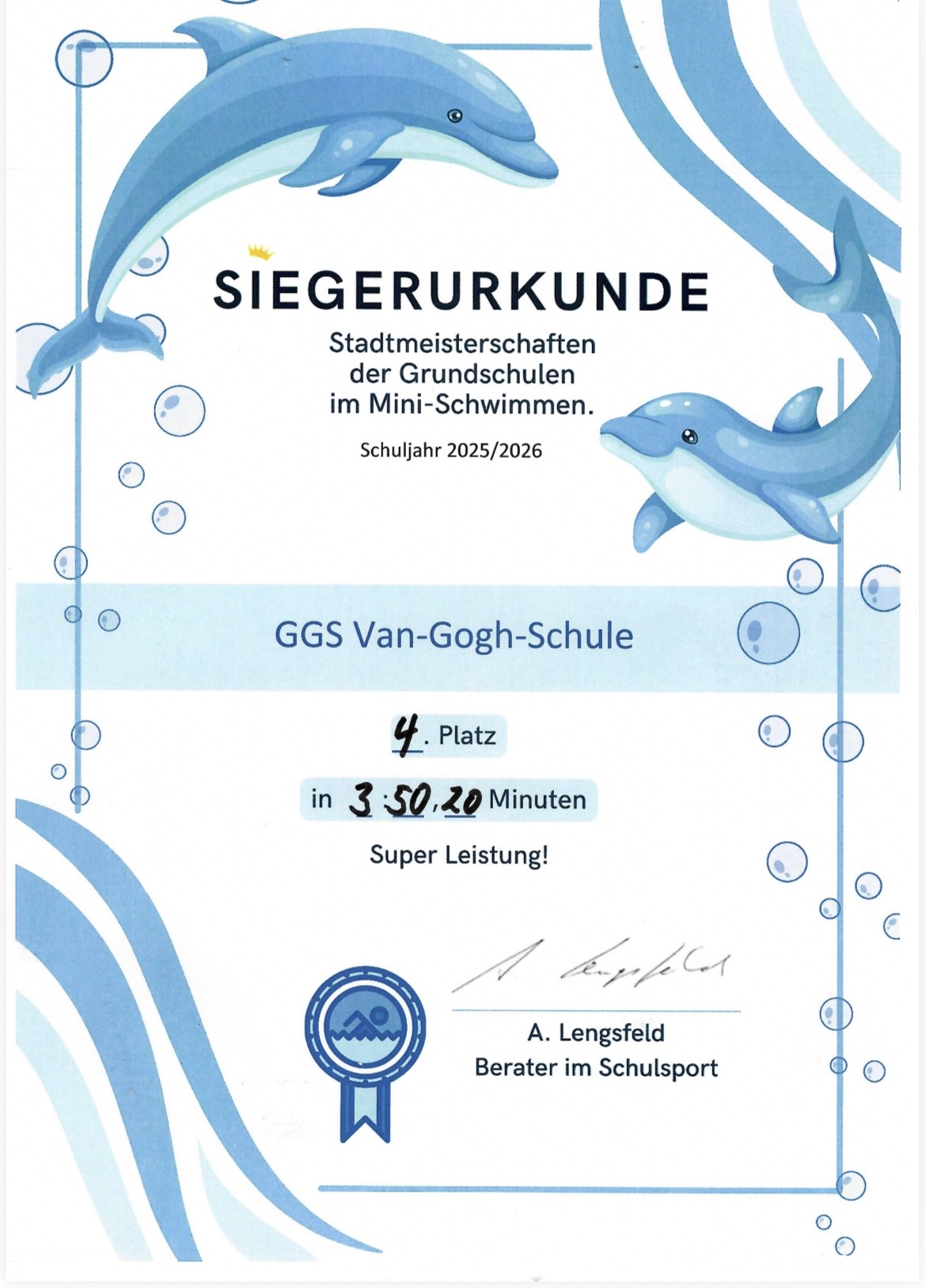 Am Dienstag, den 24.02.2026 nahm unsere Schule, die GGS Van-Gogh-Straße, erfolgreich beim Mini-Schwimmen mit dem 4. Platz von 12 Mannschaften teil. In unserer Mannschaft waren 7 Kinder der 2. Klasse.